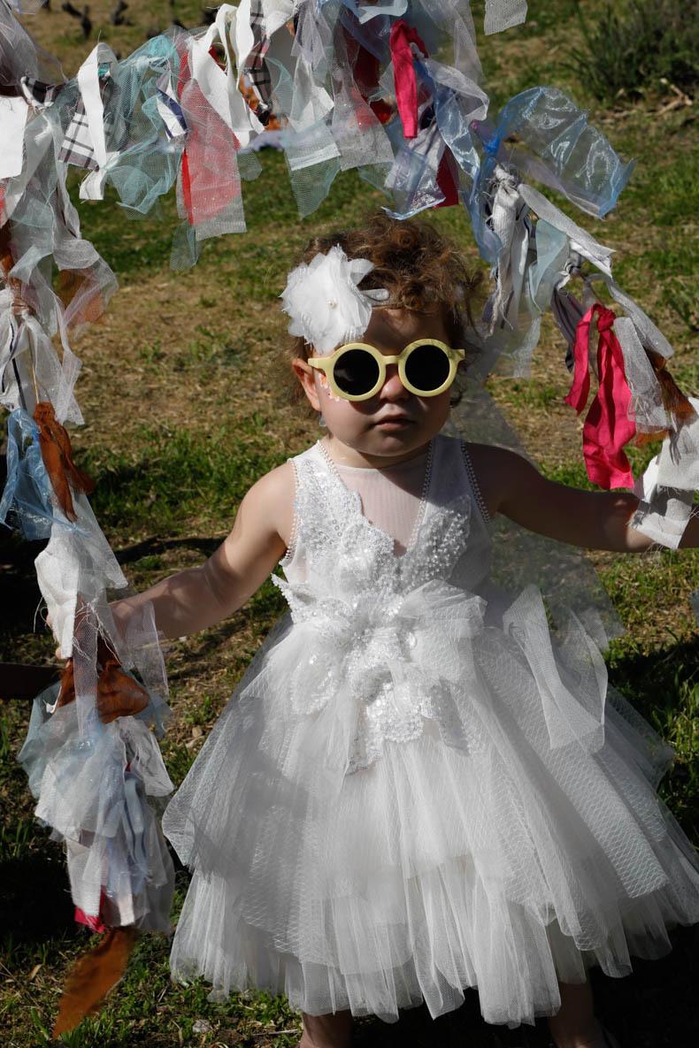 Το ρούχο το στολίζουν handmade μεταξωτά λουλούδια στο χρώμα της λεβάντας. Αξεσουάρ η μπαντάνα για το κεφάλι.