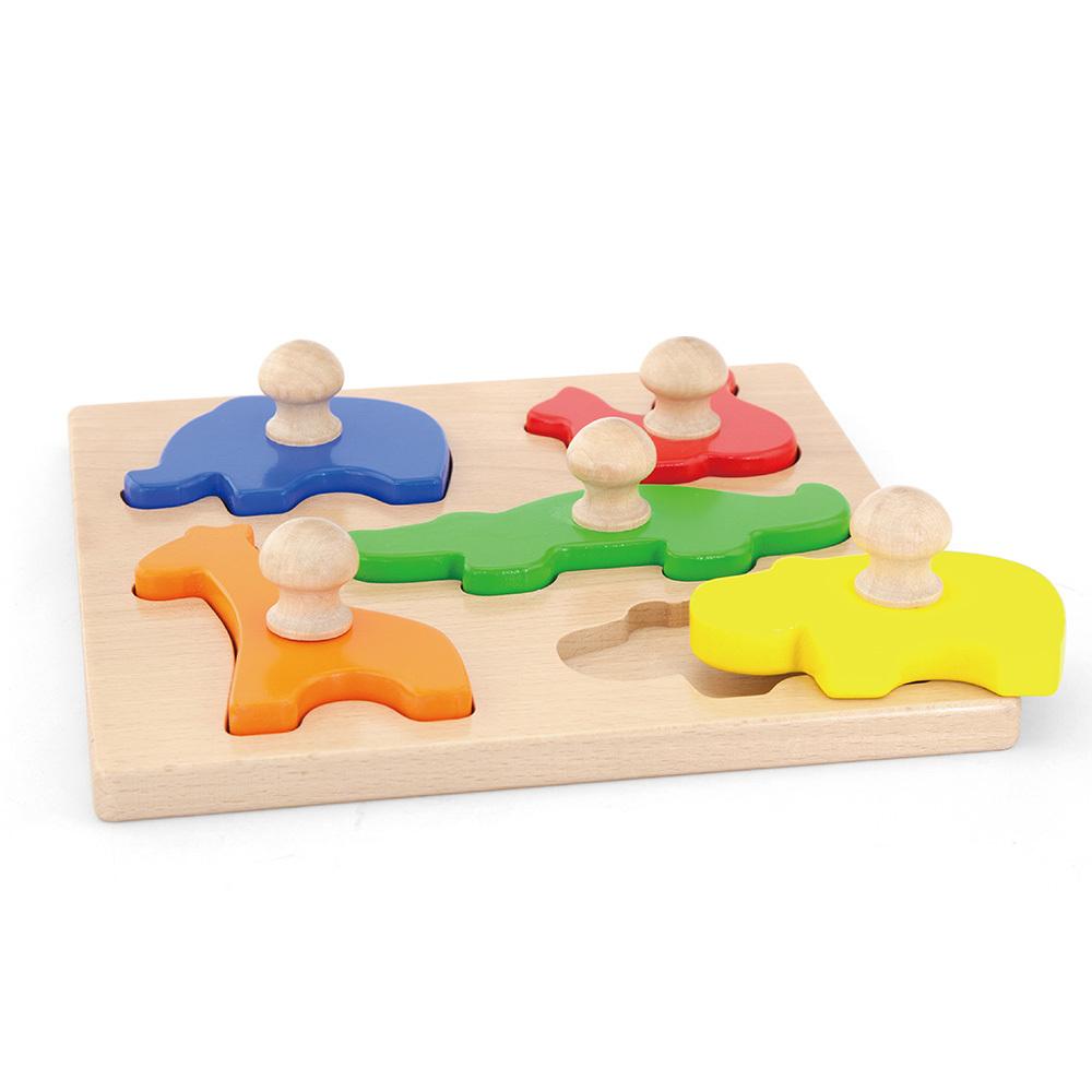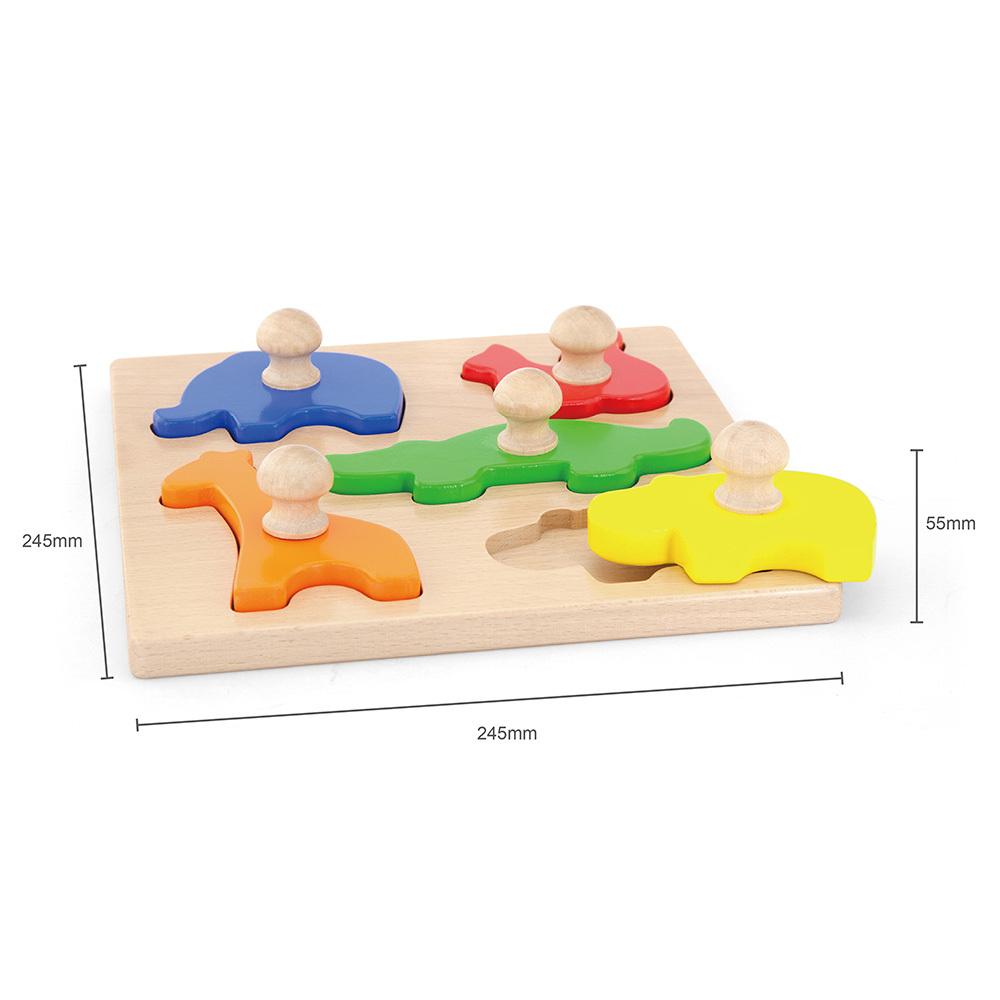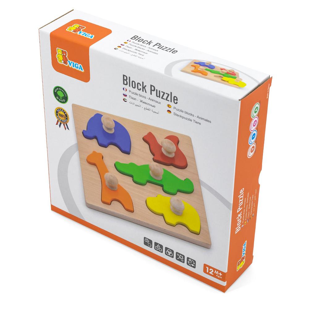 Η εταιρεία Viga δημιούργησε το συγκεκριμένο παζλ με σφηνώματα, έτσι ώστε οι μικροί μας φίλοι να αναπτύξουν δεξιότητες όπως η λεπτή κινητικότητα και ο συντονισμός χεριού- ματιού. Πολύχρωμα, ξύλινα ζωάκια σε ξύλινο ταμπλώ, κατασευασμένα από ασφαλή, οικολογικα και μη τοξικά χρώματακαι υλικά. Τα κομμάτια διαθέτουν μεγάλη λαβή στο μπροστινό μέρος, το οποίο βοηθά τα παιδιά με τα μικρά τους χεράκια να τα διαχειριστούν. Παιχνίδι κατάλληλο για παιδιά 1-3 ετών.