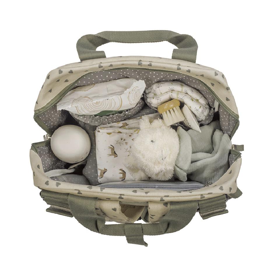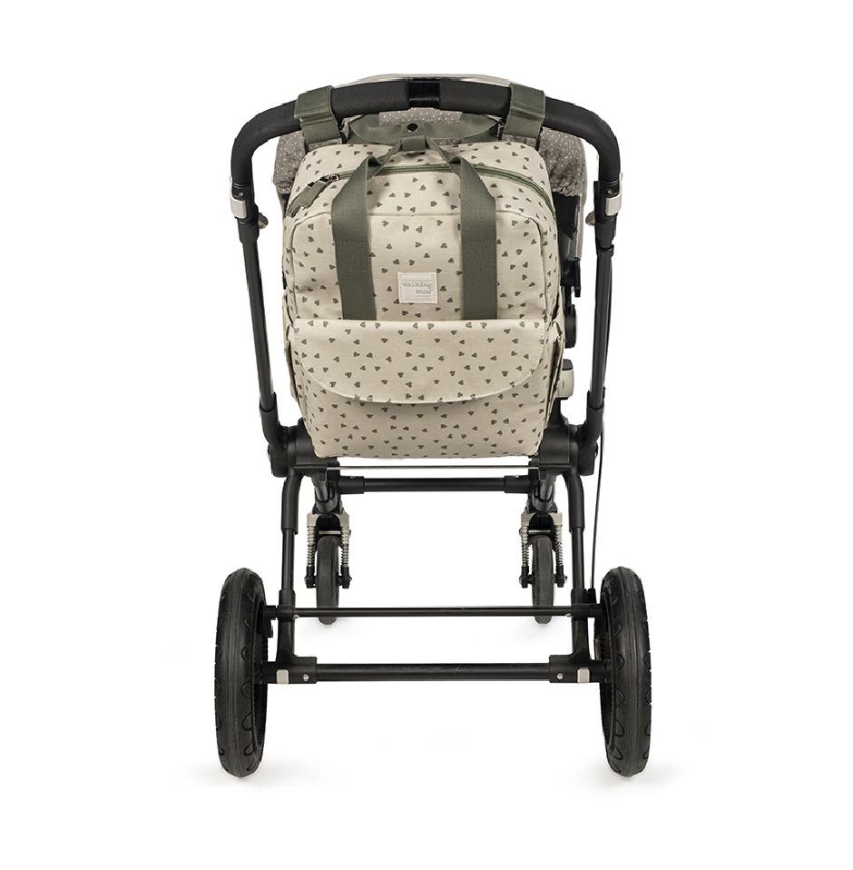 Η τσάντα περιλαμβάνει 2 ρυθμιζόμενες κοντές λαβές που διευκολύνουν την τοποθέτηση σε οποιοδήποτε μοντέλο καροτσιού, χειρολαβές και ιμάντες με επένδυση για να κρέμονται από τους ώμους μέχρι την πλάτη, χωρίς να προκαλείται ενόχληση λόγω του βάρους.