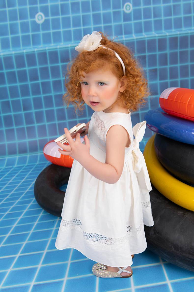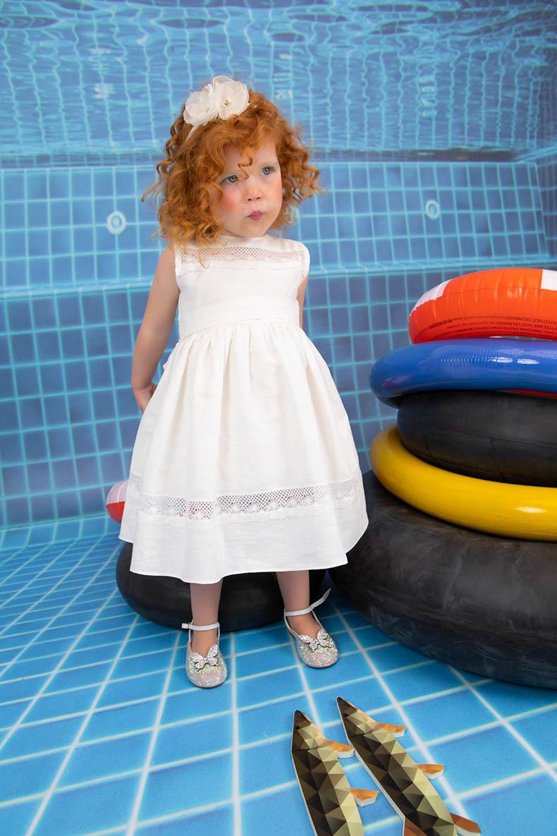 Η Xenia είναι ένα baby chic εκρού λινό φόρεμα βάπτισης που στολίζεται με πλεχτή βαμβακερή τρέσα. Συνοδεύεται στέκα για το κεφάλι με handmade λουλούδια